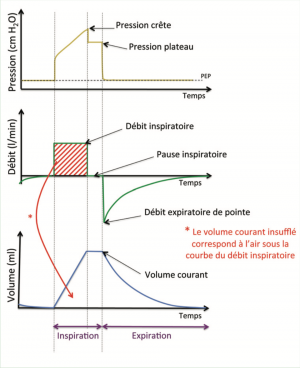 - ↑ Rapport I/E cause auto-PEEP pouvant améliorer l'oxygénation mais influencer négativement la fonction myocardique[2]