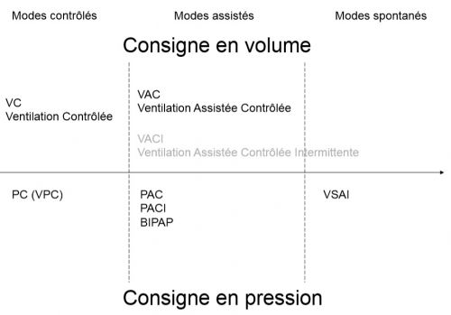 - Mode contrôlé: absence de déclenchement de la part du patient et transition inspiro-expiratoire basée sur une consigne de temps